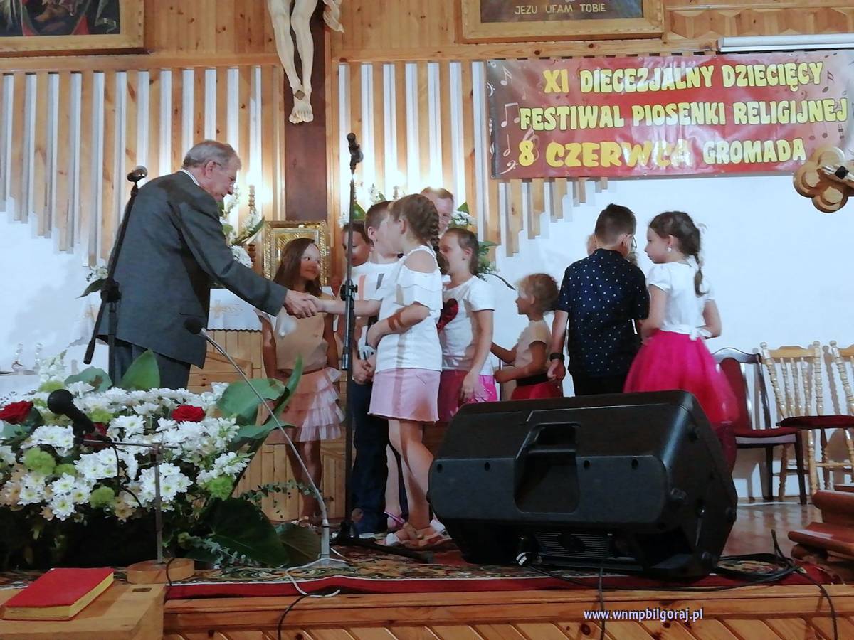 Jak co roku, na początku czerwca, mały kościółek Matki Bożej Nieustającej Pomocy w Gromadzie rozbrzmiał radosnym śpiewem płynącym niemalże z setki dziecięcych ust. Schole, soliści, zespoły wokalno-muzyczne mierzyły swe siły, by zaśpiewać Matce Bożej słuchającej najpiękniejszą pieśń. To już XI Festiwal Dziecięcej Piosenki Religijnej. Nie mogło zabraknąć na nim także naszej parafialnej scholi „Armia Nieba”. Dzieci przedstawiły dwa utwory: „Nie mądrość świata tego” oraz „Bądź królem mego serca”, którymi wywalczyły sobie III miejsce na podium zwycięzców. Naszą parafię reprezentował także Adam Mełges, który został uhonorowany nagrodą specjalną Burmistrza Miasta Biłgoraj Janusza Rosłana w kategorii solistów. Serdecznie gratulujemy wszystkim Wykonawcom, Organizatorom dziękujemy za zaproszenie, a wszystkim życzymy pasji śpiewania ku chwale Bożej.