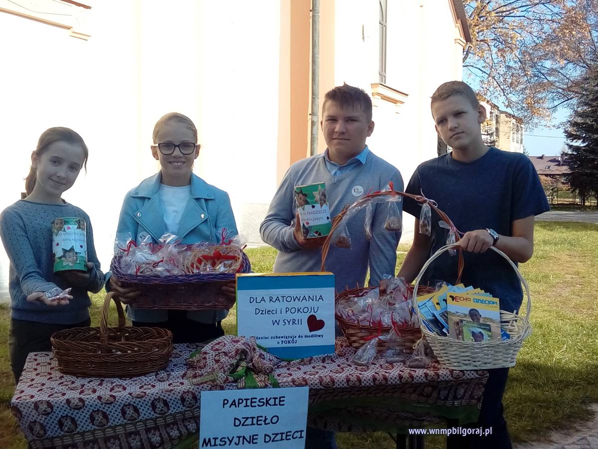 20 października 2019 r. zorganizowali w naszej parafii Niedzielę Misyjną, podczas której na Mszy św. o godz. 11:00 zaprezentowali przedstawienie „Ochrzczeni i posłani”, które było krótką refleksją na temat misji i przesłania Ojca Świętego. Po każdej Eucharystii rozdawali różańce wykonane przez chrześcijan z Syrii, zachęcając do modlitwy o pokój w tym udręczonym przez wojnę kraju. Wszyscy ci, którzy podczas Niedzieli Misyjnej wsparli swoją ofiarą dzieci w Syrii przez „Adopcję serca”, otrzymali słodki poczęstunek, przygotowany przez Rodziców dzieci z Koła Misyjnego.
